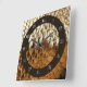 Background is a photograph of sunflower seed head in close up. Half of the seeds are missing, leaving empty cells behind, the remainder of the seeds go off into the distance in angled rows. Silver metallic numerals are set on a black ring .