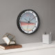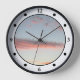 Wispy clouds with sunset colours, pale blue sky. Resembles view through a porthole. Bold black numerals at 12, 3, 6, and 9, with dots marking other numerals.