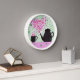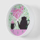 Teapot and cups with cloud of hearts rising in the steam. Multiple shapes and shades of red and pink hearts that rise in a steam cloud in the shape of a heart. Dot artwork by Deanna Pendrick. Clock numerals in darker green and faux table is pink.