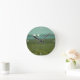 Tern in flight over marshland. Background is blurred greens and blues. Numbers 3, 6, 9, and 12 are in pale grey.