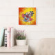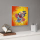 On this clock design, a portrait of a bright colored, laughing clown with a hat on the bold part of his head and pink hair on the either side of his head. The background is bright yellow and orange, with sparkling stars.