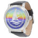 Designer watches featuring a white sailboat design on a rainbow coloured background. A great gift for those who ove to sail and sailboats and nautical items. Choose from many watch styles and colours.
