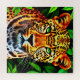 A striking close-up of a jaguar's face, showing bold leopard-like spots, vivid orange fur, and piercing green eyes framed by lush green leaves in a tropical jungle setting.