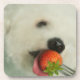 Close-up of a Bichon Frise eating a strawberry Coaster