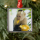 Close-up of a capuchin monkey eating a fruit metal ornament