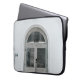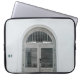 CLOSED GREY WOODEN DOOR BELOW BLACK LIGHT SCONCE LAPTOP SLEEVE