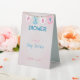 Personalise this adorable baby shower table tent sign with all your custom information.