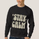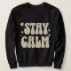 The phrase “STAY CALM” is presented in a retro, bubbly typeface with playful star accents, evoking the 1960s–70s era of peace movements, psychedelic posters, and an optimistic counterculture. The soft cream lettering against the dark background makes the words stand out almost like a glowing reminder in the night.