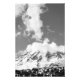 A black and white photograph of Mount Rainier with clouds forming and collecting at it's peak. A string of clouds have escaped the volcano's grasp and rises further up into the sky. Snow still covers the landscape, and tree growth scatters across the foreground. Image Copyright ©2023 Kimberly J Tilley. zazzle.com/store/developingnature