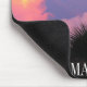 This inspirational Mouse Pad is an original photograph by MaeFlowers of clouds in the eastern sky reflecting the sunset in the west, over the Gulf of Mexico. The tropical evening sky is bathed in a warm pink glow above the dark silhouette of palm trees. The clouds are developing into very interesting shapes, looking almost like fluffy toys or...use your imagination...the soft pink colours of the sheer clouds near the bottom of the photo intensify as the sun hits the thick, billowing shapes of the thicker clouds rising into the sky. The puffy shapes at the top of the clouds have yellow highlights. Centred near the bottom of the mousepad is the word IMAGINE, in tall thin white capital letters over the dark background of palm trees. This text is set to be personalised, or deleted as you like.