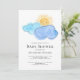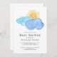 This cute boy's baby shower invitation is decorated with watercolor clouds and the sun.