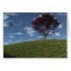 A peaceful 3D landscape in spring or summer, created in Vue. On top of a hill covered with green grass and colourful primroses, against a blue sky with wisps of cloud, a solitary red Japanese maple stands with a wooden bench under it to stop and rest on. A lone eagle soars by on the wind.