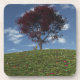 A peaceful 3D landscape in spring or summer, created in Vue. On top of a hill covered with green grass and colourful primroses, against a blue sky with wisps of cloud, a solitary red Japanese maple stands with a wooden bench under it to stop and rest on. A lone eagle soars by on the wind.