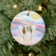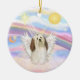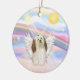 A Havanese angel floats in heaven's fluffy clouds with a shining sun and star and moon in the distance