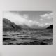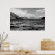 Black and white view of a stormy Lake Wakatipu in Queenstown, New Zealand, with clouds rolling in over the mountains.