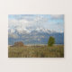 This puzzle shows a beautiful photograph of the stunning Teton Mountain Range in Wyoming, with the famous Moulton barn at the base. Gorgeous!