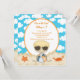 Summer Birthday??? Yeah!! Start your celebration off right with this adorable beach scene invite. Whether it's a party on the beach or just a beach theme it's perfect for you. There's sand along the bottom with an orange crab and starfish in it. A boy with long blonde hair is sitting in the sand holding a colourful beach ball. He has a large head and he's wearing dark sunglasses. There's a large white oval in the centre outlined in orange. There's a blue background with white clouds all over it. Check out our many other designs and products in this line.