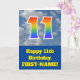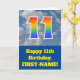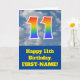 The front of this fun 11th birthday greeting card design features a representation of a cloudy blue sky, along with the number "11" having a multicolored rainbow spectrum like gradient look. The front also features a birthday greeting message, including a customisable recipient name. The inside features a personalised birthday greeting message, or could perhaps be cleared and left blank if a message is to be written by hand instead. A custom birthday card like this might be a fun way to send birthday wishes to somebody who is celebrating their eleventh birthday. [~Z0000370]