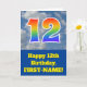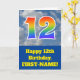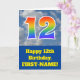The front of this fun 12th birthday greeting card design features a representation of a cloudy blue sky, along with the number "12" having a multicolored rainbow spectrum like gradient look. The front also features a birthday greeting message, including a personalised recipient name. The inside features a customised birthday greeting message, or could perhaps be cleared and left blank if a message is to be written by hand instead. A customisable birthday card like this might be a fun way to acknowledge somebody’s twelfth birthday. [~Z0000370]