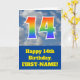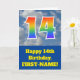 The front of this fun 14th birthday greeting card design features a cloudy blue sky depiction, along with the number "14" having a multicolored rainbow spectrum like gradient look. The front also features a birthday greeting message, including a customizable recipient name. The inside features a customizable birthday greeting message, or could perhaps be cleared and left blank if a message is to be written by hand instead. A personalized birthday card like this might be a fun way to acknowledge somebody’s fourteenth birthday. [~Z0000370]
