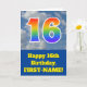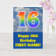 The front of this fun 16th birthday greeting card design features a cloudy blue sky depiction, along with the number "16" having a multicolored rainbow spectrum like gradient look. The front also features a birthday greeting message, including a custom recipient name. The inside features a custom birthday greeting message, or could perhaps be cleared and left blank if a message is to be written by hand instead. A customisable birthday card like this might be a fun way to send birthday wishes to somebody who is celebrating their sixteenth birthday. [~Z0000370]