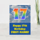 The front of this fun 17th birthday greeting card design features a cloudy blue sky depiction, along with the number "17" having a multicolored rainbow spectrum like gradient pattern. The front also features a birthday greeting message, including a personalised recipient name. The inside features a customisable birthday greeting message, or could perhaps be cleared and left blank if a message is to be written by hand instead. A personalised birthday card like this might be a fun way to send birthday wishes to somebody who is celebrating their seventeenth birthday. [~Z0000370]