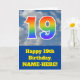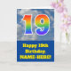 The front of this fun 19th birthday greeting card design features a depiction of a cloudy blue sky, along with the number "19" having a multicolored rainbow spectrum like gradient pattern. The front also features a birthday greeting message, including a customizable recipient name. The inside features a personalized birthday greeting message, or could perhaps be cleared and left blank if a message is to be written by hand instead. A personalized birthday card like this might be a fun way to send birthday wishes to somebody who is celebrating their nineteenth birthday. [~Z0000370]