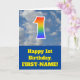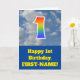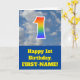 The front of this fun 1st birthday greeting card design features a representation of a blue sky with clouds, along with the number "1" having a multicolored rainbow spectrum like gradient look. The front also features a birthday greeting message, including a customisable recipient name. The inside features a customised birthday greeting message, or could perhaps be cleared and left blank if a message is to be written by hand instead. A personalised birthday card like this might be a fun way to send a message in celebration of somebody’s first birthday. [~Z0000370]