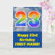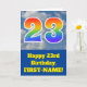 The front of this fun 23rd birthday greeting card design features a representation of a cloudy blue sky, along with the number "23" having a multicolored rainbow spectrum like gradient look. The front also features a birthday greeting message, including a personalized recipient name. The inside features an editable birthday greeting message, or could perhaps be cleared and left blank if a message is to be written by hand instead. A personalized birthday card like this might be a fun way to acknowledge somebody’s twenty third birthday. [~Z0000370]