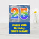 The front of this fun 25th birthday greeting card design features a depiction of a cloudy blue sky, along with the number "25" having a multicolored rainbow spectrum like gradient pattern. The front also features a birthday greeting message, including an editable recipient name. The inside features a customised birthday greeting message, or could perhaps be cleared and left blank if a message is to be written by hand instead. A customisable birthday card like this might be a fun way to acknowledge somebody’s twenty fifth birthday. [~Z0000370]