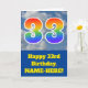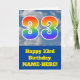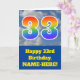 The front of this fun 33rd birthday greeting card design features a representation of a cloudy blue sky, along with the number "33" having a multicolored rainbow spectrum like gradient look. The front also features a birthday greeting message, including a personalised recipient name. The inside features a customised birthday greeting message, or could perhaps be cleared and left blank if a message is to be written by hand instead. A customisable birthday card like this might be a fun way to send birthday wishes to somebody who is celebrating their thirty third birthday. [~Z0000370]