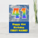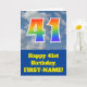 The front of this fun 41st birthday greeting card design features a depiction of a cloudy blue sky, along with the number "41" having a multicolored rainbow spectrum like gradient pattern. The front also features a birthday greeting message, including an editable recipient name. The inside features an editable birthday greeting message, or could perhaps be cleared and left blank if a message is to be written by hand instead. A customizable birthday card like this might be a fun way to acknowledge somebody’s forty first birthday. [~Z0000370]