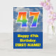 The front of this fun 47th birthday greeting card design features a cloudy blue sky depiction, along with the number "47" having a multicolored rainbow spectrum like gradient look. The front also features a birthday greeting message, including a customizable recipient name. The inside features a custom birthday greeting message, or could perhaps be cleared and left blank if a message is to be written by hand instead. A customizable birthday card like this might be a fun way to send a message in celebration of somebody’s forty seventh birthday. [~Z0000370]