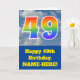 The front of this fun 49th birthday greeting card design features a cloudy blue sky depiction, along with the number "49" having a multicolored rainbow spectrum like gradient look. The front also features a birthday greeting message, including an editable recipient name. The inside features a personalised birthday greeting message, or could perhaps be cleared and left blank if a message is to be written by hand instead. A personalised birthday card like this might be a fun way to send a message in celebration of somebody’s forty ninth birthday. [~Z0000370]