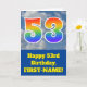 The front of this fun 53rd birthday greeting card design features a representation of a cloudy blue sky, along with the number "53" having a multicolored rainbow spectrum like gradient look. The front also features a birthday greeting message, including a custom recipient name. The inside features a personalised birthday greeting message, or could perhaps be cleared and left blank if a message is to be written by hand instead. A personalised birthday card like this might be a fun way to send birthday wishes to somebody who is celebrating their fifty third birthday. [~Z0000370]