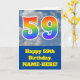 The front of this fun 59th birthday greeting card design features a representation of a cloudy blue sky, along with the number "59" having a multicolored rainbow spectrum like gradient look. The front also features a birthday greeting message, including an editable recipient name. The inside features a customizable birthday greeting message, or could perhaps be cleared and left blank if a message is to be written by hand instead. A birthday card like this might be a fun way to send birthday wishes to somebody who is celebrating their fifty ninth birthday. [~Z0000370]