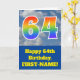 The front of this fun 64th birthday greeting card design features a depiction of a blue sky with clouds, along with the number "64" having a multicolored rainbow spectrum like gradient pattern. The front also features a birthday greeting message, including an editable recipient name. The inside features a customizable birthday greeting message, or could perhaps be cleared and left blank if a message is to be written by hand instead. A customizable birthday card like this might be a fun way to send birthday wishes to somebody who is celebrating their sixty fourth birthday. [~Z0000370]