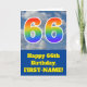 The front of this fun 66th birthday greeting card design features a depiction of a cloudy blue sky, along with the number "66" having a multicolored rainbow spectrum like gradient pattern. The front also features a birthday greeting message, including an editable recipient name. The inside features a customizable birthday greeting message, or could perhaps be cleared and left blank if a message is to be written by hand instead. A customizable birthday card like this might be a fun way to acknowledge somebody’s sixty sixth birthday. [~Z0000370]
