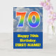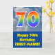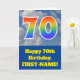 The front of this fun 70th birthday greeting card design features a representation of a blue sky with clouds, along with the number "70" having a multicolored rainbow spectrum like gradient look. The front also features a birthday greeting message, including a personalised recipient name. The inside features an editable birthday greeting message, or could perhaps be cleared and left blank if a message is to be written by hand instead. A personalised birthday card like this might be a fun way to acknowledge somebody’s seventieth birthday. [~Z0000370]
