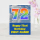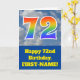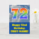 The front of this fun 72nd birthday greeting card design features a cloudy blue sky depiction, along with the number "72" having a multicolored rainbow spectrum like gradient look. The front also features a birthday greeting message, including an editable recipient name. The inside features a personalized birthday greeting message, or could perhaps be cleared and left blank if a message is to be written by hand instead. A personalized birthday card like this might be a fun way to acknowledge somebody’s seventy second birthday. [~Z0000370]