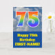 The front of this fun 75th birthday greeting card design features a depiction of a cloudy blue sky, along with the number "75" having a multicolored rainbow spectrum like gradient pattern. The front also features a birthday greeting message, including a custom recipient name. The inside features a personalised birthday greeting message, or could perhaps be cleared and left blank if a message is to be written by hand instead. A customisable birthday card like this might be a fun way to send birthday wishes to somebody who is celebrating their seventy fifth birthday. [~Z0000370]