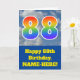 The front of this fun 88th birthday greeting card design features a depiction of a cloudy blue sky, along with the number "88" having a multicolored rainbow spectrum like gradient pattern. The front also features a birthday greeting message, including a custom recipient name. The inside features a custom birthday greeting message, or could perhaps be cleared and left blank if a message is to be written by hand instead. A custom birthday card like this might be a fun way to send birthday wishes to somebody who is celebrating their eighty eighth birthday. [~Z0000370]