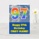 The front of this fun 97th birthday greeting card design features a representation of a cloudy blue sky, along with the number "97" having a multicolored rainbow spectrum like gradient look. The front also features a birthday greeting message, including a personalised recipient name. The inside features an editable birthday greeting message, or could perhaps be cleared and left blank if a message is to be written by hand instead. A personalised birthday card like this might be a fun way to acknowledge somebody’s ninety seventh birthday. [~Z0000370]