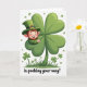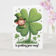 This card features a cheerful leprechaun peeking from behind an oversized four-leaf clover, his rosy cheeks and pointed ears framed by a wide, friendly grin that feels like a wink shared with a close friend 💚. He wears an emerald-green top hat with a gold buckle and a matching green jacket dotted with shiny gold buttons, giving him a tidy, storybook look. The giant clover fills most of the scene in layered green tones, curling around him like a cozy backdrop that draws you in ☘️. A bright white background keeps the greens and warm skin tones standing out, while small shamrocks drift around the page like confetti. Near the bottom, a short strip of stylized grass grounds the picture and adds a gentle outdoor touch. The greeting text sits low on the card in dark lettering, easy to spot against the pale background and neatly aligned beneath the main illustration. A few tiny shamrocks float near the top corners, with the largest clover centered behind the leprechaun’s hat and shoulders.