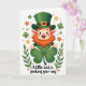 This card features a cheerful leprechaun-like character on a bright white background, smiling wide with rosy cheeks and a curly orange beard that frames his round face. He wears a green top hat with a shiny gold buckle, and his green outfit looks smooth under soft, even lighting. His hands cradle an oversized four-leaf clover 💚, held close like a small gift meant for someone special. Around him, smaller clovers ☘️ and tiny flowers in orange, pink, and pale yellow float like confetti, adding a gentle springtime feel. Low on the design, leafy green branches curve in from the sides and help frame the character without crowding him. The phrase “A little luck is peeking your way” sits beneath the illustration in green lettering, centered and easy to spot against the white space. The clover in his hands is shaded in deeper and lighter greens, and the gold buckle catches the light with a small gleam.