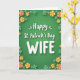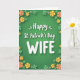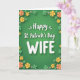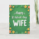 This greeting card opens on a deep emerald green background that sets a festive St. Patrick’s Day scene 💚. Centered text reads “Happy St. Patrick’s Day WIFE,” with “Happy St. Patrick’s Day” in a flowing, cursive style and “WIFE” in thicker rounded letters that feel like an affectionate emphasis. The lettering appears in light tones with a soft shadow that lifts it slightly from the green. Small leaf accents sit near the wording, echoing the holiday theme and adding a gentle, romantic touch, like a quiet squeeze of the hand beside the message. Around the edges, a border of stylized clovers frames the center, mixing several greens with sunny gold and soft coral-orange highlights ☘️. Thin curling tendrils link the clovers like a loose garland, guiding the eye inward. The clovers vary in size and spacing, forming a decorative frame against the emerald field.