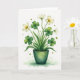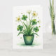 This card shows a potted clover plant painted in soft watercolor tones, set against a bright white background that keeps everything airy and focused. A full cluster of green leaves fills the center, with several four-leaf clovers tucked among small white five-petal flowers that lean toward each other like close friends. The blossoms have tiny golden-yellow centers that add warmth, and the stems curve gently as if sharing space in a quiet, affectionate way 💚. The pot sits at the bottom in deep green with subtle shading, grounding the plant while the lighter greens above feel fresh and light. Near the base, small shamrock shapes and loose green paint flecks scatter outward, giving the scene a casual, breezy motion ☘️. There’s no large headline across the top, keeping the artwork as the main focus, while any greeting text would sit neatly below the pot in a matching green. Tiny shamrock silhouettes and soft green splatters drift across the lower background, especially around the pot’s base and along the bottom edge for extra detail.