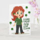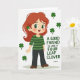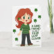This card features a ginger-haired girl with emerald eyes and an open-mouthed smile, standing on the left as if she’s just turned towards a close friend. Her auburn hair falls in soft curves, and a single four-leaf clover is tucked behind her ear like a sweet little nod to someone special ☘️. She wears a horizontally striped shirt in layered greens, set against a bright white background sprinkled with small, deep forest-green clovers. The scene feels friendly and a bit romantic in a gentle way, like the smile you share when you’re in on the same lucky secret 💚. On the right side, green lettering is stacked in clear lines and reads, “A GOOD FRIEND IS LIKE A FOUR LEAF CLOVER.” The text sits comfortably in the open space, balancing her figure and drawing your eye across the page. Scattered clovers dot the background around both the girl and the words, with the darkest ones standing out most against the white.
