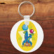 A clown standing on its head with some balloons around it. This design looks really effective on this Keychain