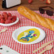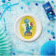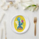 A clown standing on its head with some balloons around it. This design looks really effective on this Paper Plates